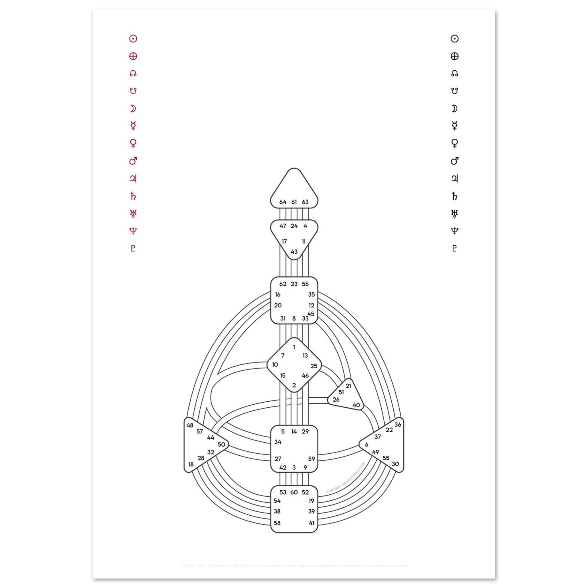 A clean Bodygraph with all 64 gates already marked inside the centers. This sheet gives you space to highlight, color, or annotate the gates directly. A great tool for students and practitioners who want to become familiar with the gate locations and start recognizing patterns in the chart.