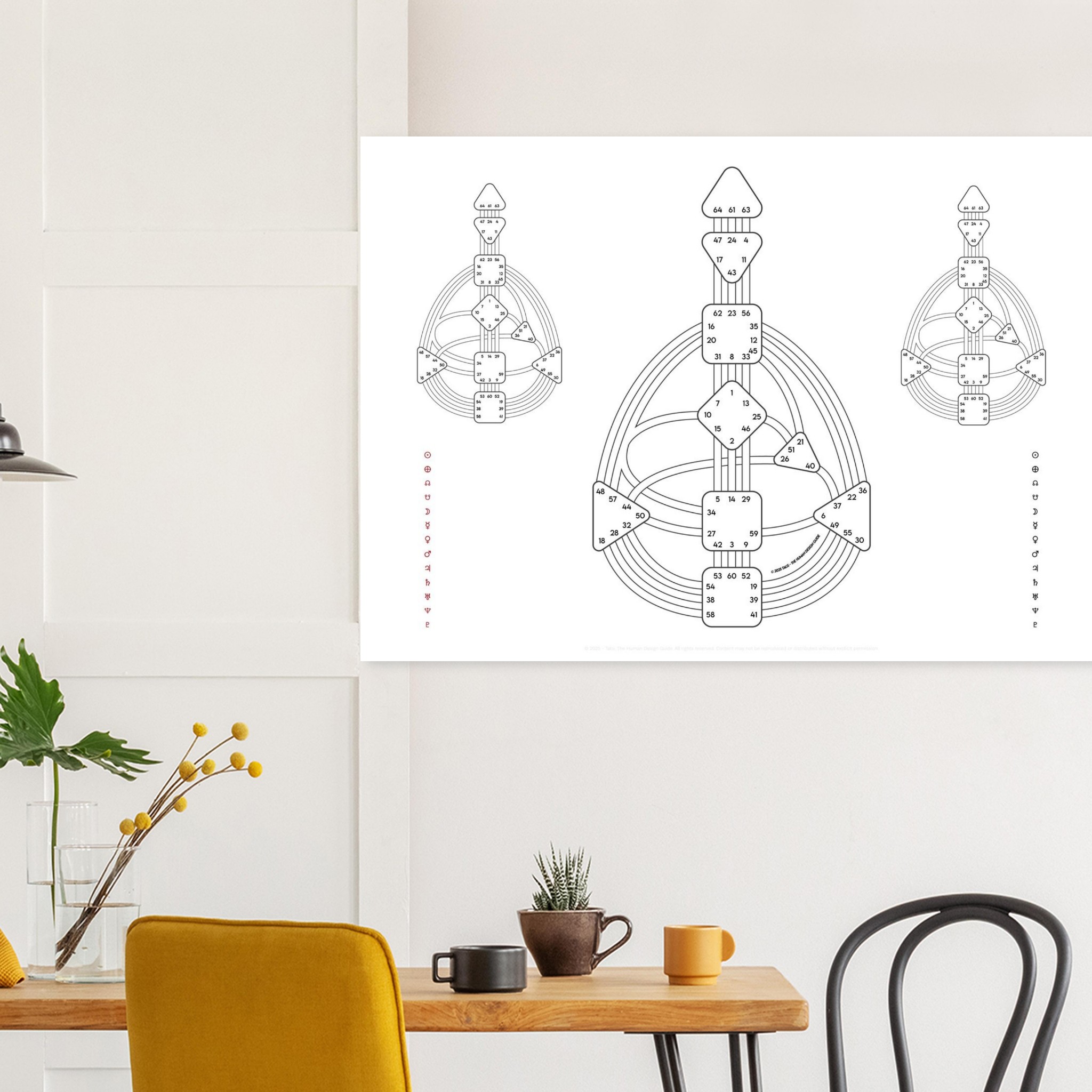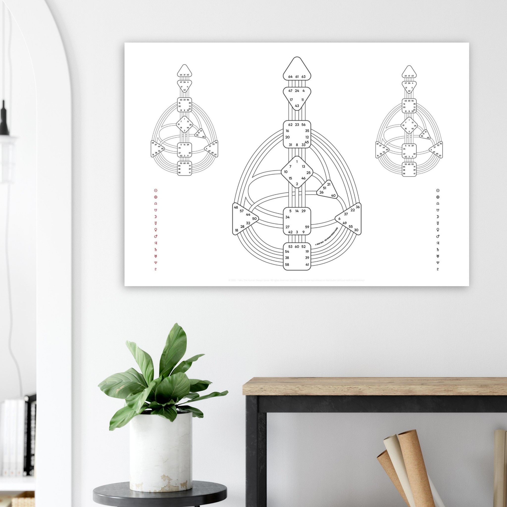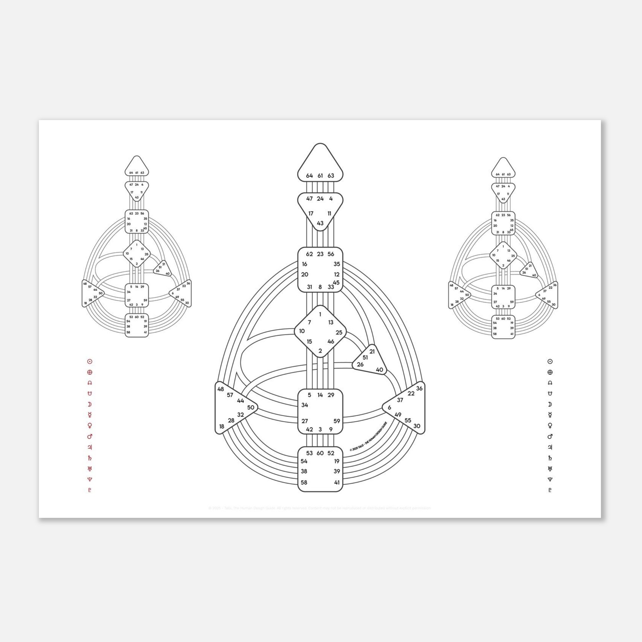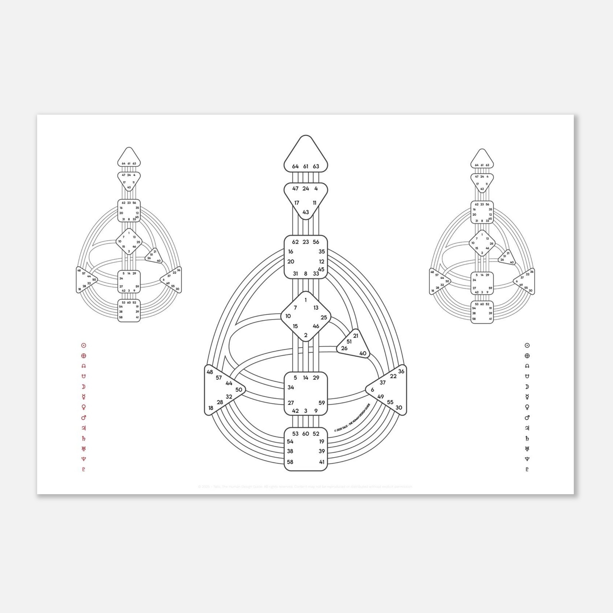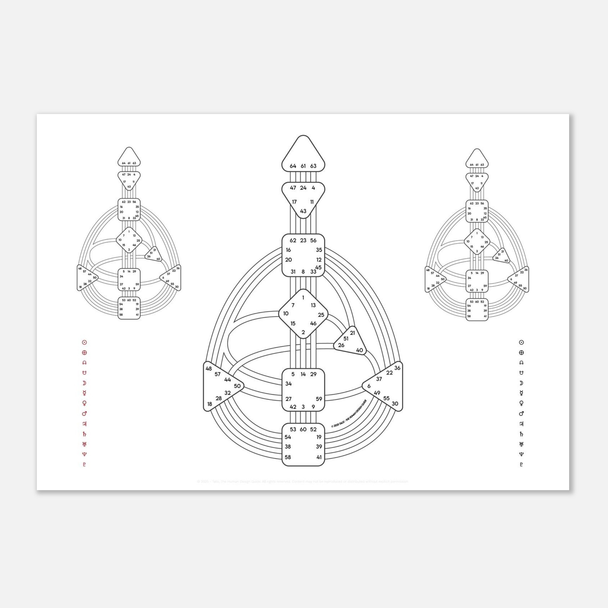 This sheet shows two separate Bodygraphs on the left and right, merging into one in the center. Use it to compare two people (relationship or composite charts) or to separate your own red (Design) and black (Personality) activations before combining them into the full Quantum. A simple but powerful study tool.