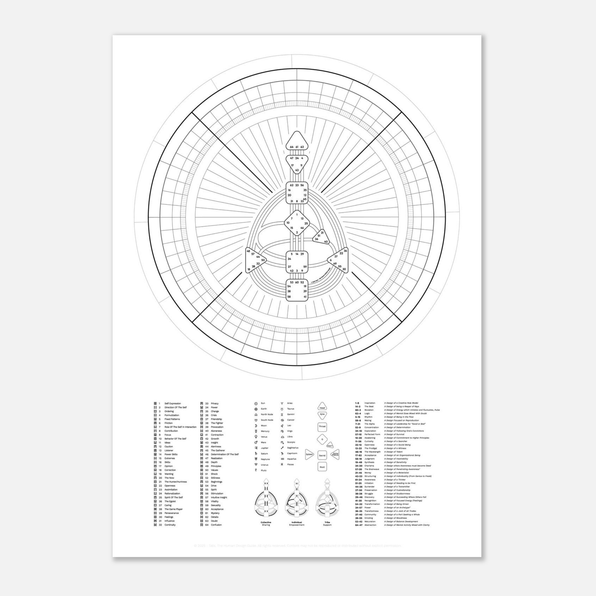 A full empty Rave Mandala with the Bodygraph in the center. Around it you find the wheel of the 64 hexagrams. At the bottom there’s a compact index with all gates, channels, planets, circuits, and zodiac signs. A detailed study reference and visual overview in one sheet.